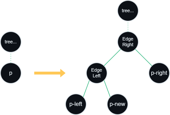 From this procedure we see that one parabola is being deleted while three new are being added. This means that at least two new internal nodes have to be created (since parabolas must represent leaves of the tree). Those two internal nodes will represent edges starting from split point of parabola p